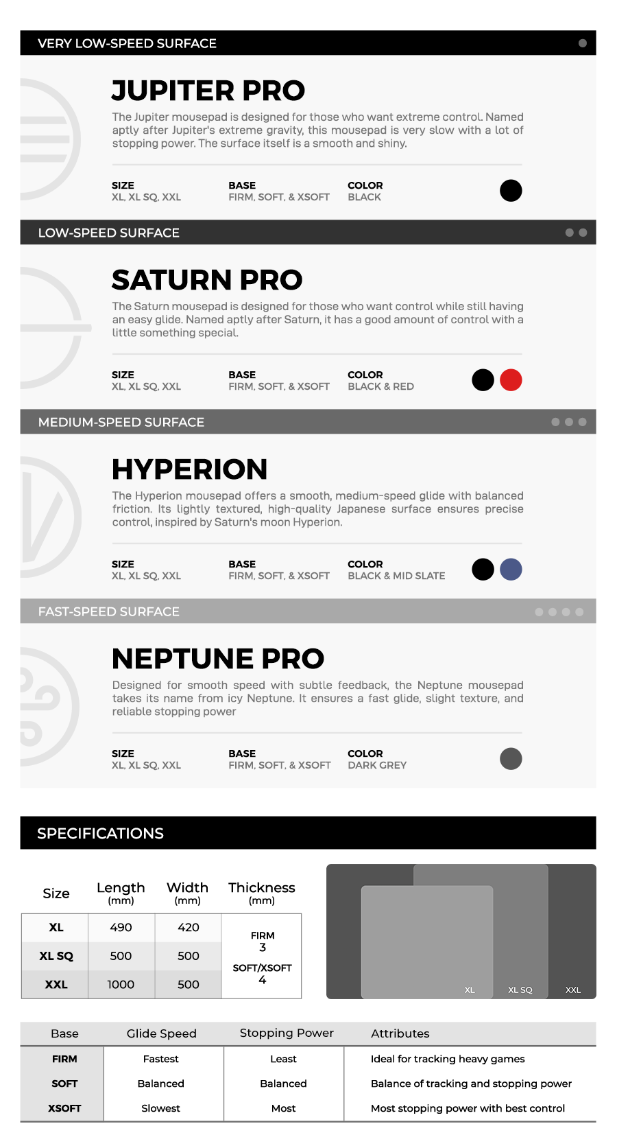 The Hyperion mouse pad is designed for those seeking smooth, controlled gliding at medium speeds, with a high-quality surface made in Japan. Its name is inspired by one of Saturn's moons, and the two surfaces share similarities in texture and performance.